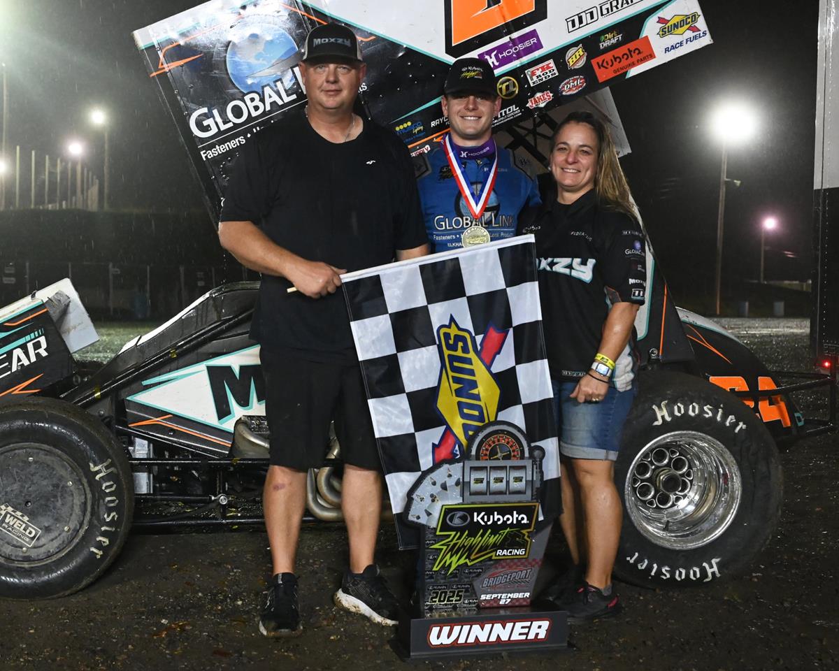 Leading at the time of Lap 10, when a downpour engulfed Bridgeport Speedway, Saturday's race was called complete and the 23-year-old North Port, Florida native was officially declared the feature winner for a $12,000 payday.