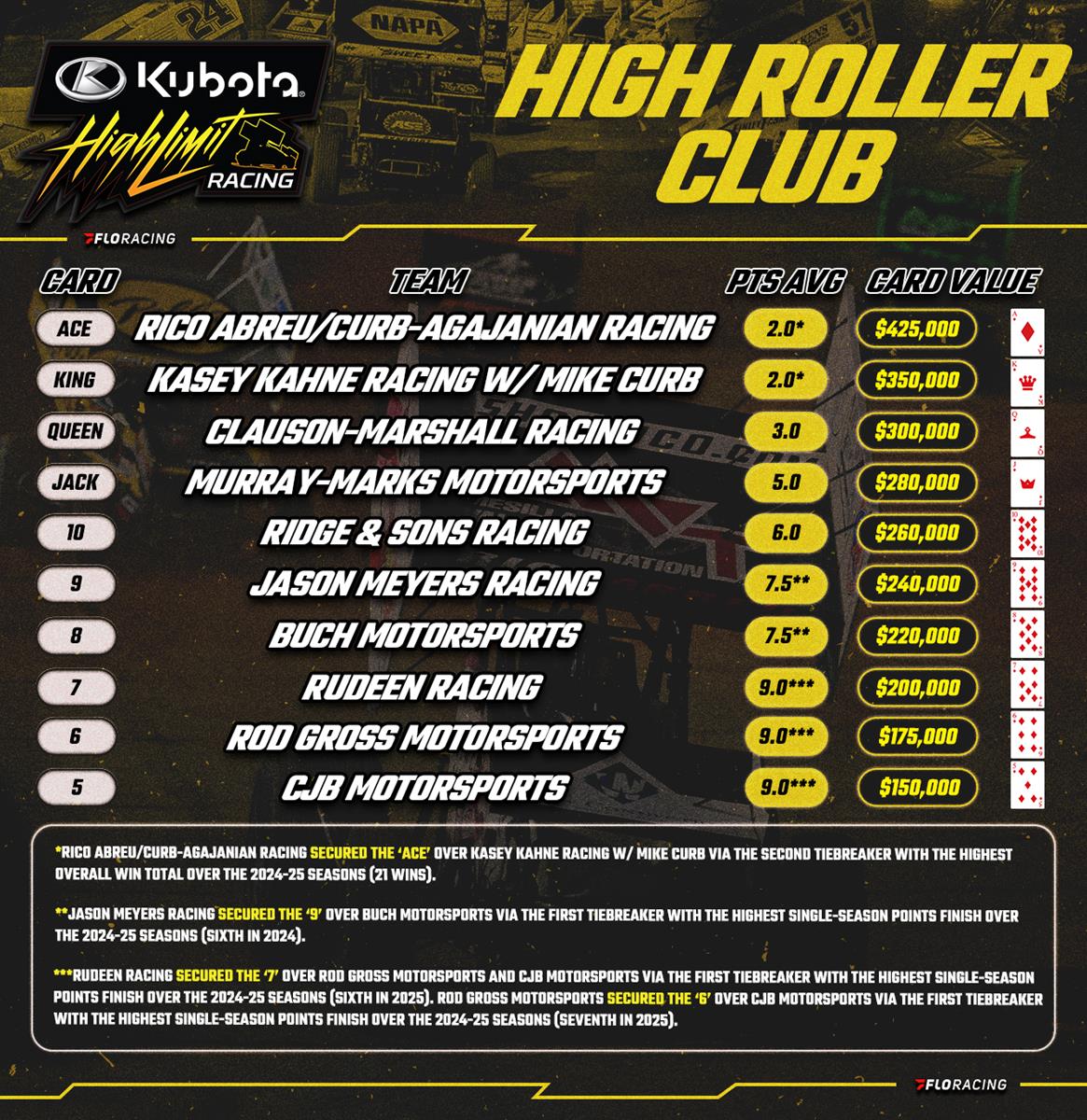 The High Roller Club will shuffle any newly-issued cards into the deck beginning in the 2028 season. All present membership cards will carry forward. Future membership rankings will continue to be based on each team’s two-year average finish in the Kubota High Limit Racing point standings.